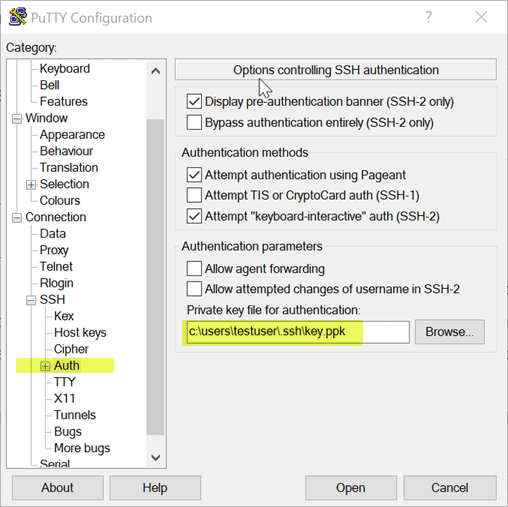 Now you should have aย .ppkย file that can be used in theย Authย properties of the SSH session to authenticate with public key authentication.