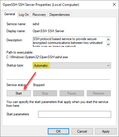 After you install OpenSSH in Windows Server 2019, the service is not automatically configured as theย Startup type: Automatic. You can set the startuptype as Automatic and then start the service. You can also use theย set-service PowerShell cmdletย to set the startup type.
