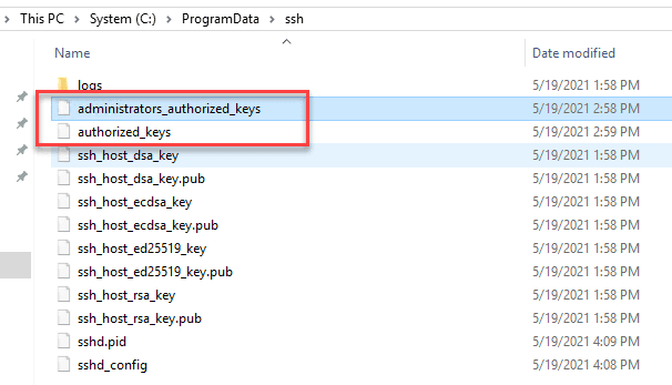 You will want to start both theย OpenSSH Authentication Agentย and theย OpenSSH SSH Server. Starting the authentication agent creates theย authorized_keysย file among other things in the Programdata\ssh directory.