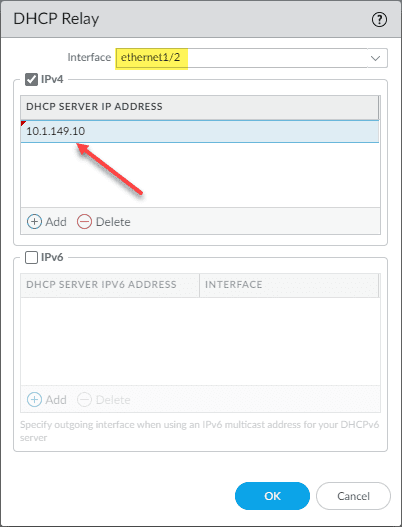 The configuration of DHCP Relay is generally simple but can vary depending on the vendor of router, firewall, or other device you might be using to perform this function. Below is the configuration of DHCP Relay on a Palo Alto firewall. You simply have to select the Interface and the DHCP Server IP Address you want to use for the target of DHCP requests.
