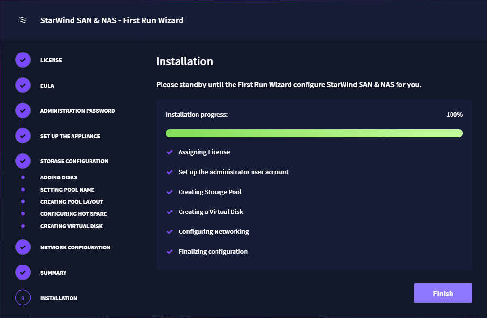 Once you make it through the storage configuration portion of the first run wizard, you will “install” the product. This only takes just a couple of minutes. Once done, click finish, and browse to the StarWind SAN & NAS Free browser interface in a web browser, port 8643.