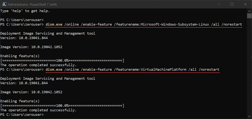 The next step is to install the Virtual Machine Platform on Windows 10. Again, in a PowerShell prompt, run the following command: