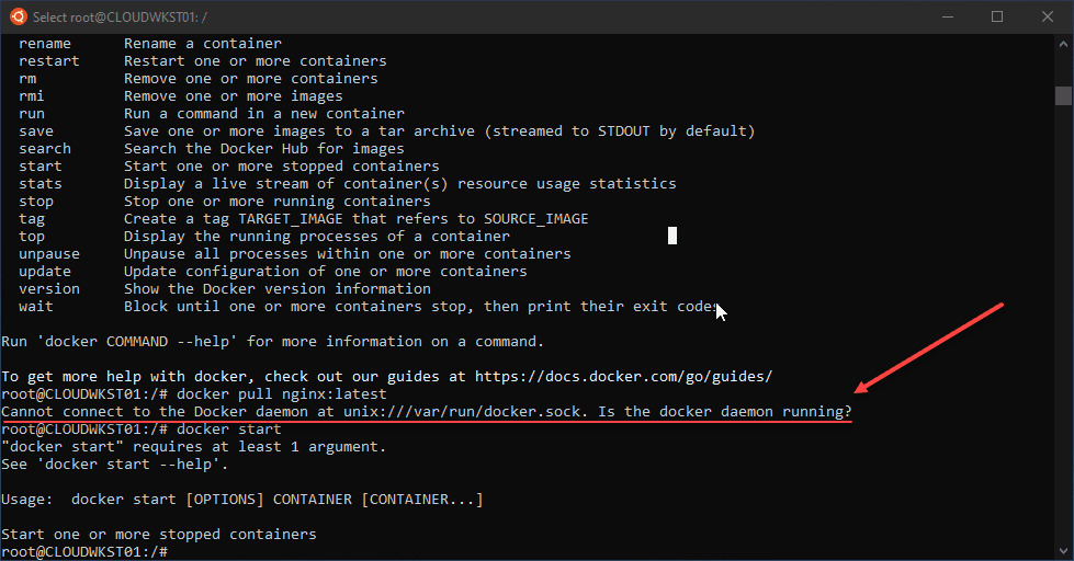 However, if you attempt to run any Docker commands outside of simply running the “docker” command to display the parameters, you will see the error below: