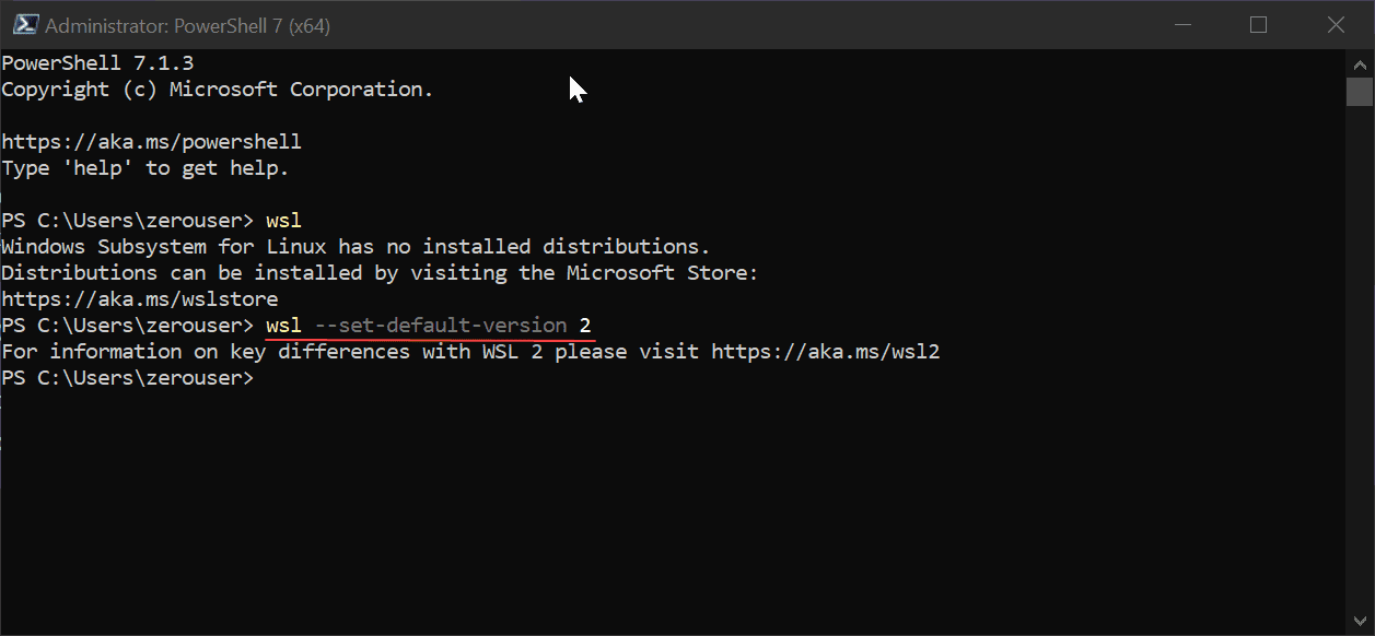 The next step is to set the default WSL version to WSL 2. This is easily done with the command below: