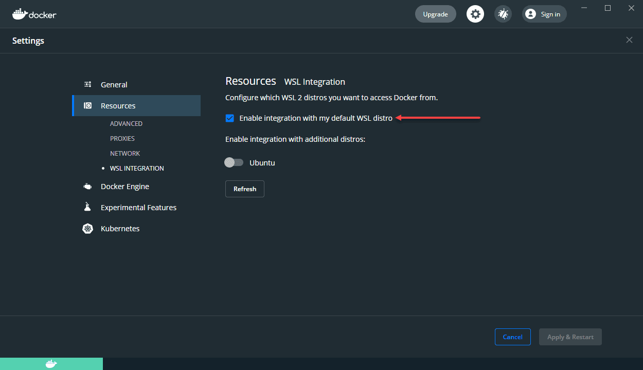 After you install Docker Desktop, you can verify the integration with your default WSL distro is enabled under the Settings > Resources > WSL Integration section.