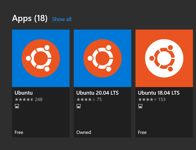 There are several flavors of Linux found in the Microsoft Store for running in WSL 2. For this walkthrough, I will be using the Ubuntu App. You will see several options here. In the Microsoft Store, you will see specific versions of Ubuntu listed which you can download. You can also choose the Ubuntu app. This installs the latest version available in the store and then will update when a new version is available.