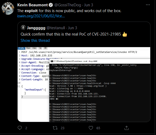 The big question with any exploit is always, “is it exploited in the wild?” As the CVE-2021-21985 rates a 9.8 out of 10, we all figured it was a good possibly that it would be exploited quickly. That definitely seems to be the case. Take note of the article ran on Ars Technica: