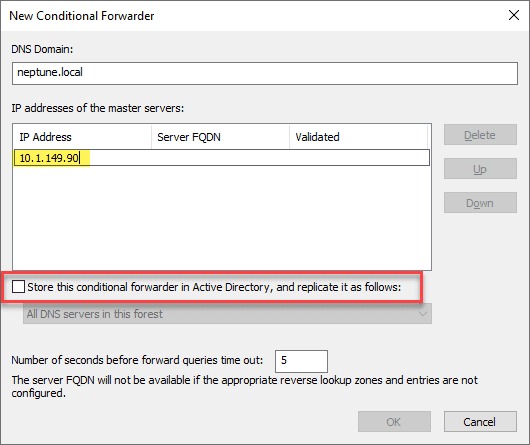 Add the IP address to the master servers. Select whether or not you want the Conditional forwarder domain to be included in Active Directory replication. If you have multiple DCs, this is generally the best approach, unless there is a reason you do not want to replicate the DNS zone.