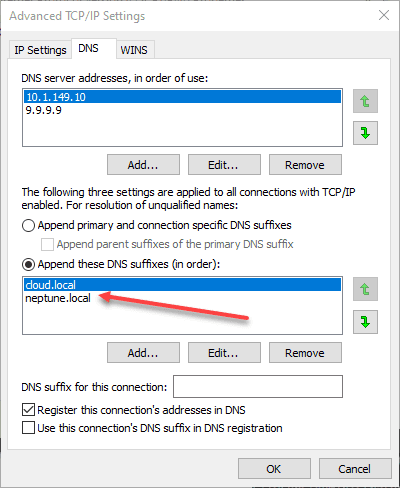 Are you adding the DNS suffixes on the DNS server set up with ‘Conditional Forwarding’ Advanced TCP/IP settings or would each client/workstation need the ‘Append DNS Suffixes’ set in their Advanced TCP/IP settings?