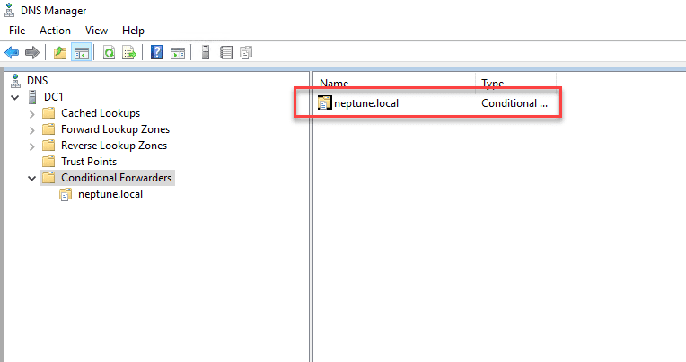 In the DNS server below, the primary domain is cloud.local (an internal domain). I have spun up another internal test domain called neptune.local. Right-click the Conditional forwarders node and select New Conditional Forwarder.