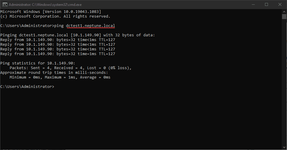 Now, the benefits of conditional forwarding become evident. Since we have added a conditional forwarder, your DNS server settings you have configured on your management workstation do now have to change. The DNS server simply forwards the requests for the new internal domain to the conditional forwarder and name resolution works as expected.