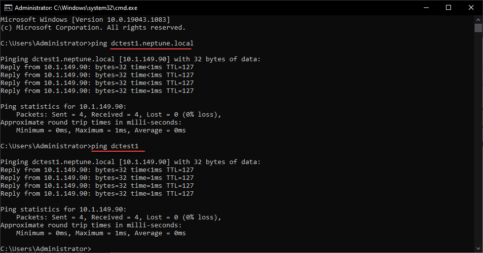 Now, I can ping the server with the short name and it will reply with the FQDN as it goes through the list of DNS suffixes for name resolution until it finds a match for the server. If you have servers with the same name, it will return the server in the first zone configured in the DNS suffixes as it works its way from top down.