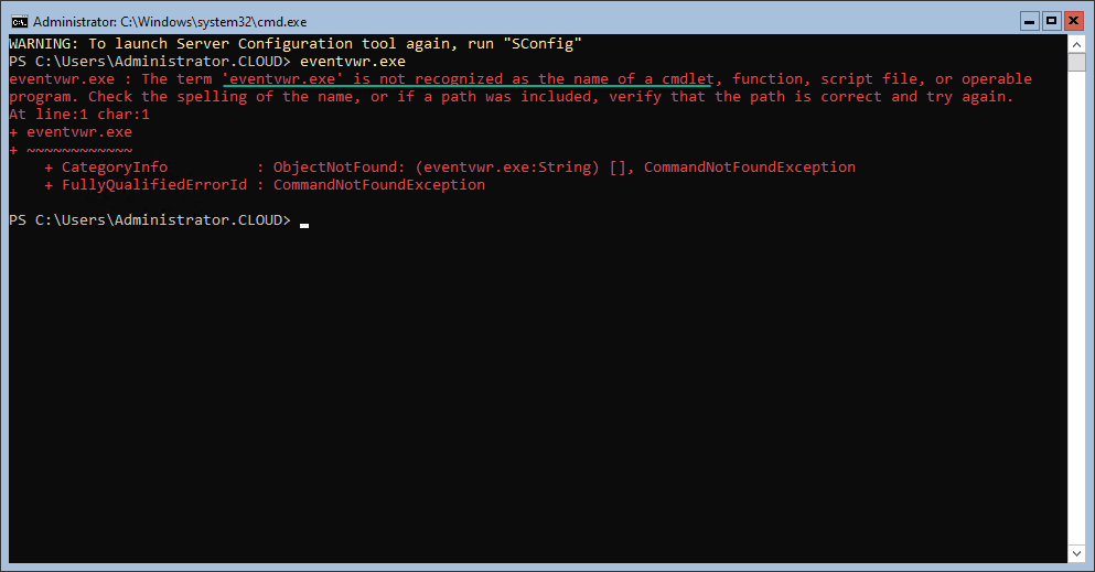 Note, without adding the Features on Demand (FoD) package to Windows Server 2022 Core edition, attempting to launch Event Viewer fails as expected.