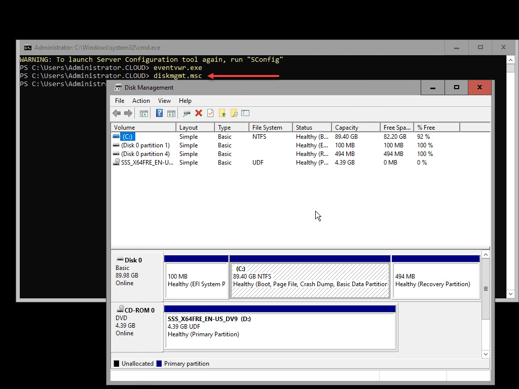 Pulling up disk management can be done by typing the diskmgmt.msc command. This is handy to look at disk configuration, ensure drive letters, and format and provision disks if needed.