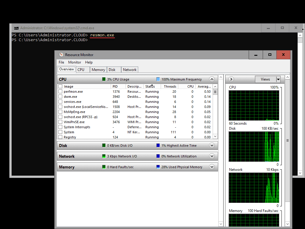 Resource Monitor is a great tool to troubleshoot performance and see where resources are utilized. It is great to have access to this tool on a Windows Server 2022 Core installation locally to view key performance indicators on your Core installation.