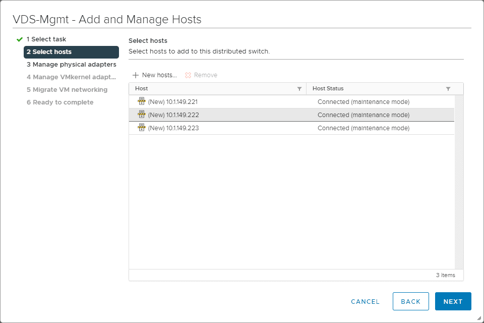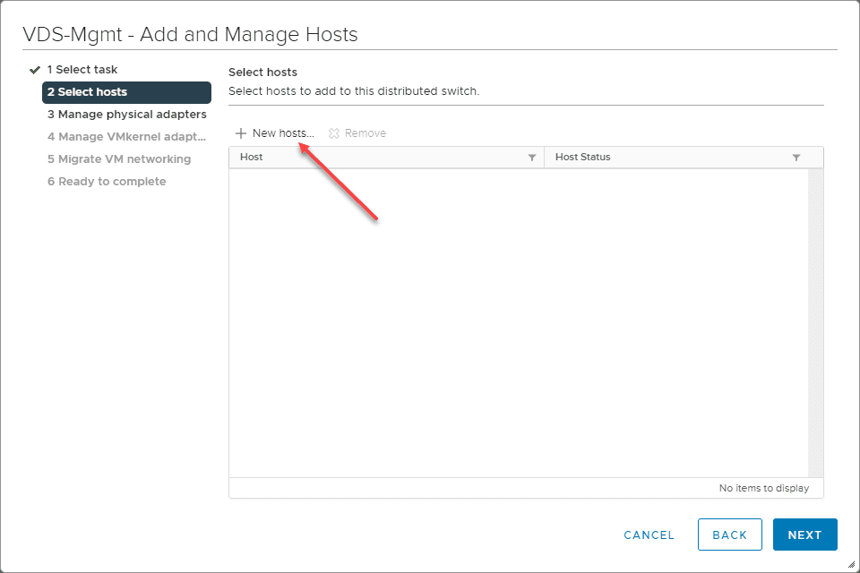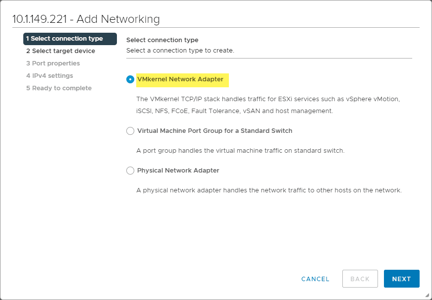 Do the same for your vSAN vDS switch as the process shown above. Note, there will be no existing VMkernel port to reassign. For the vSAN vDS, we just need to add the switch to the ESXi hosts. We will create a VMkernel port for vSAN next. After you have added the hosts to the vDS switch for vSAN, you need to add a VMkernel port. To do that, you right-click each host and choose Add Networking. Choose VMkernel Network Adapter.
