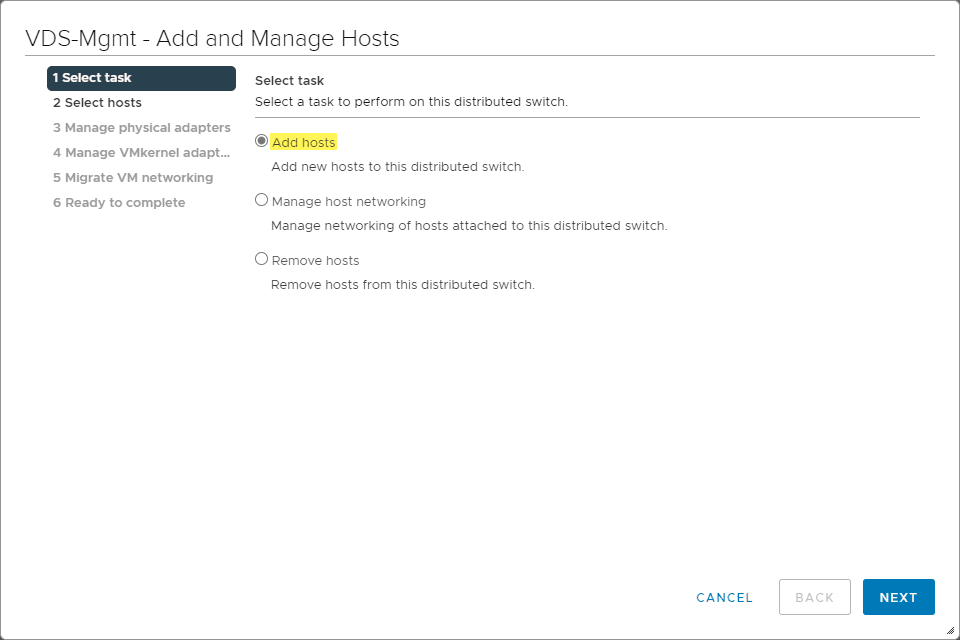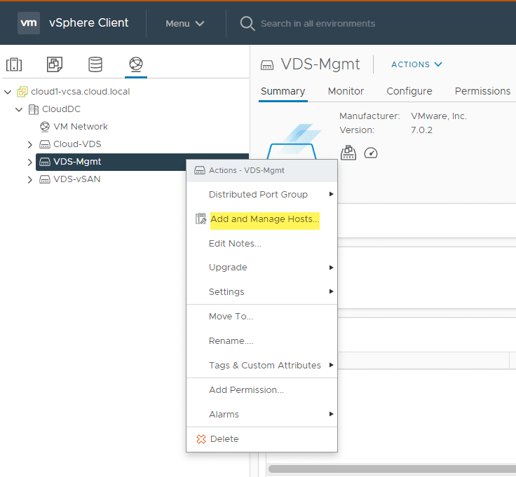 After you create a vDS, you add it to the ESXi hosts. Right-click your switches and then choose the Add and Manage Hosts option.