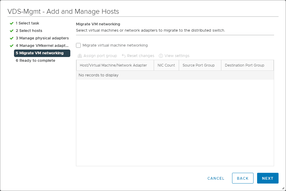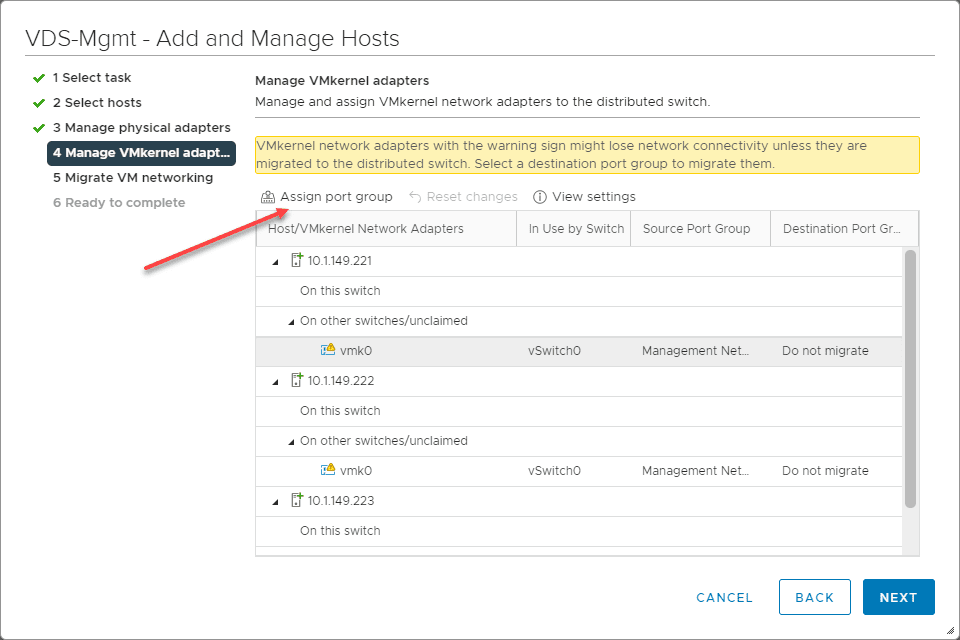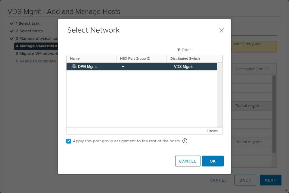 Let’s assign the port group for the Management VMkernel port. During the process of adding the hosts to this management vDS, the management VMkernel port is migrated to the port group defined in the steps below.