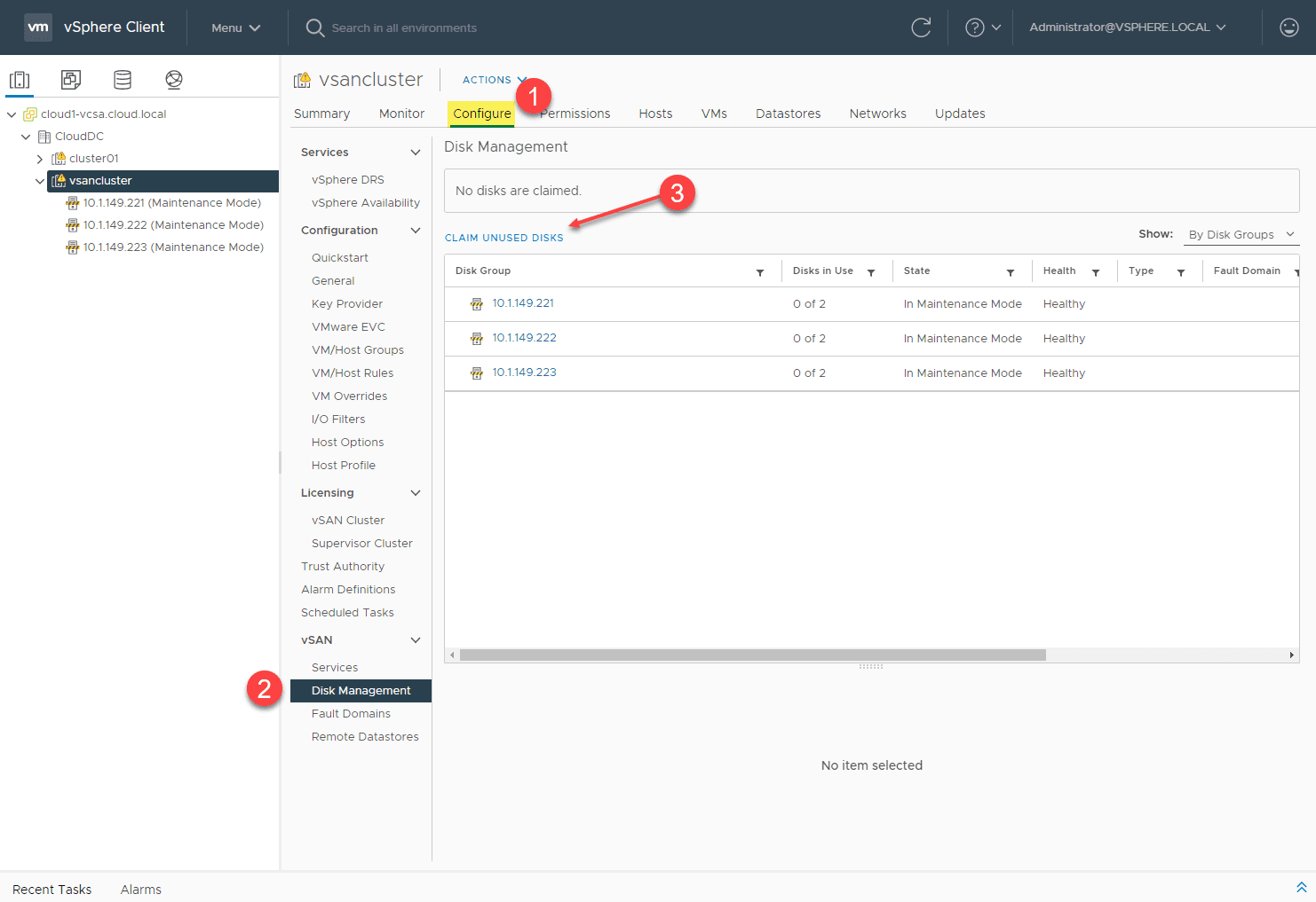 Now that we have the networking side of the vSAN cluster housed in our VMware Workstation environment, we can work on the storage side. With vSAN, each host has a disk group that contributes to the overall vSAN storage capacity. If you navigate to Configure > vSAN > Disk Management > Claim Unused Disks it will launch the wizard to claim all available disks for vSAN use.