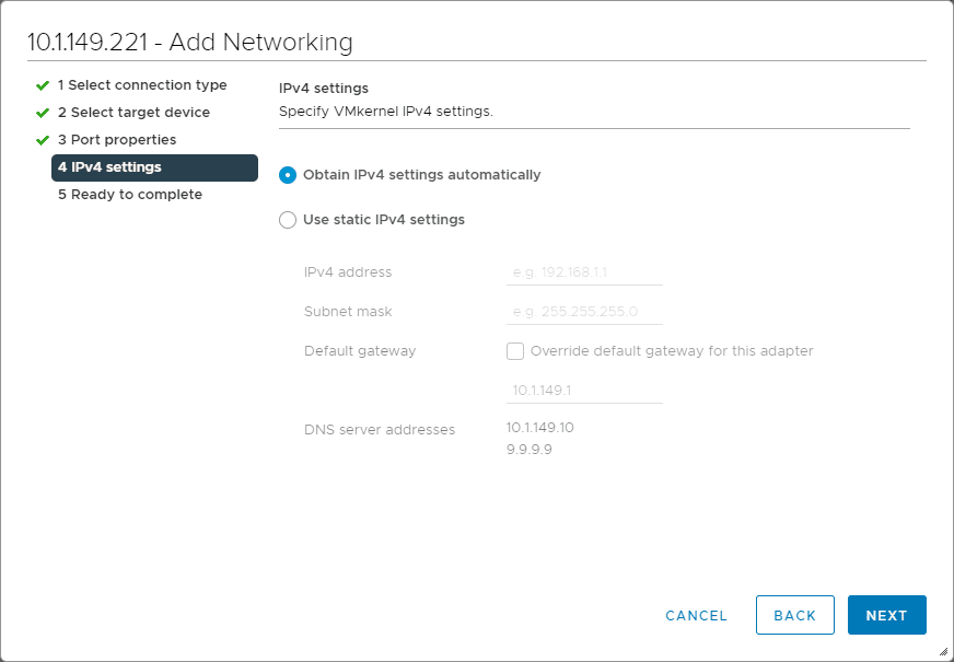 In VMware Workstation, the network segment that I created for vSAN which is backing the vSAN network is enabled with DHCP. Here, I am just leaving it as DHCP which saves the work of having to configure static IPs for the VMkernel ports on all three hosts.