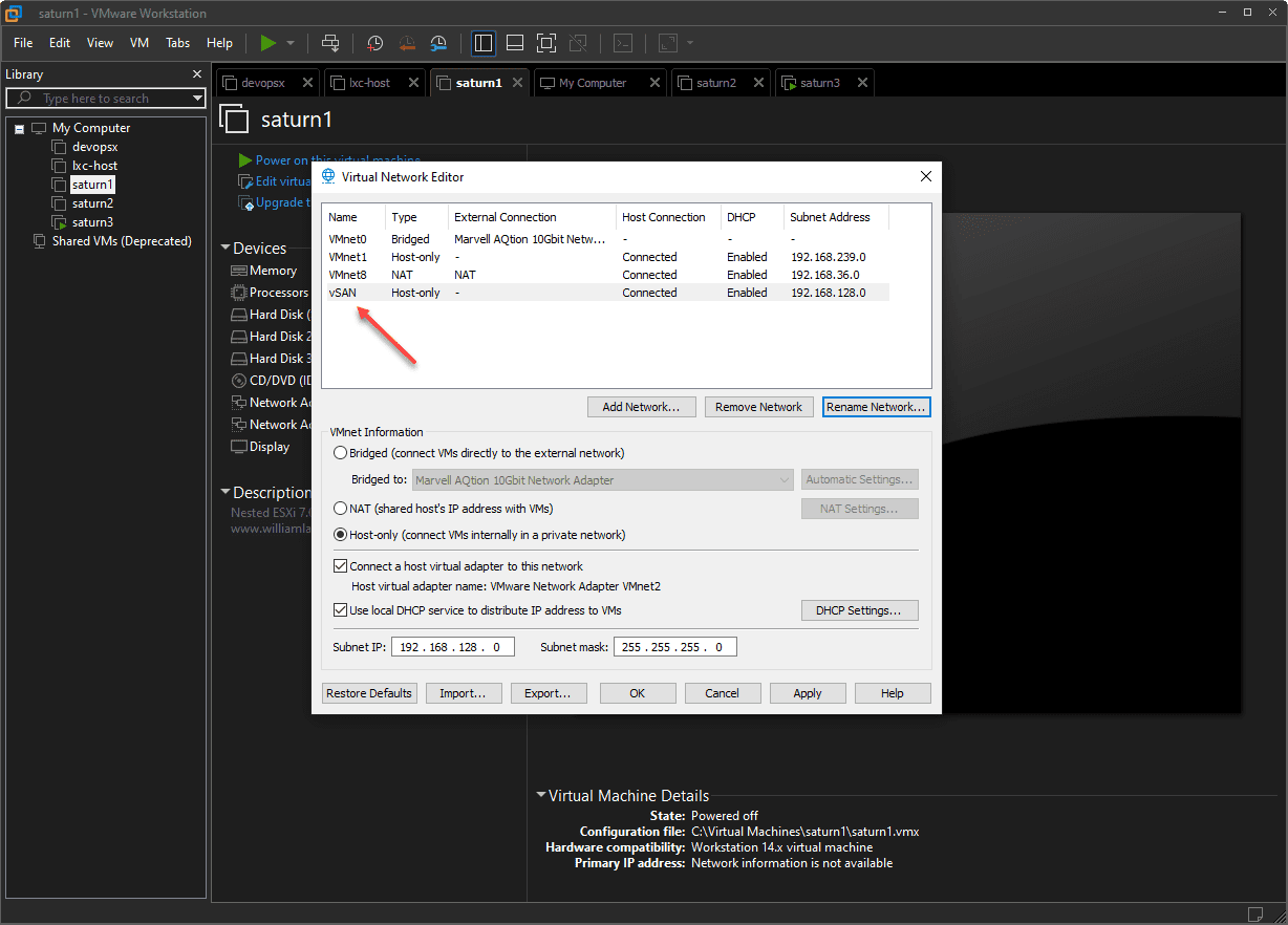 Also, I created a vSAN network in VMware Workstation to handle the vSAN traffic. I will attach the ESXi hosts’ second network adapter to this network in VMware Workstation. Notice I have DHCP enabled on the vSAN network. This will make things easier when it comes to adding the vSAN VMkernel ports later. We won’t have to worry about statically assigning these in the vSAN lab on VMware Workstation.