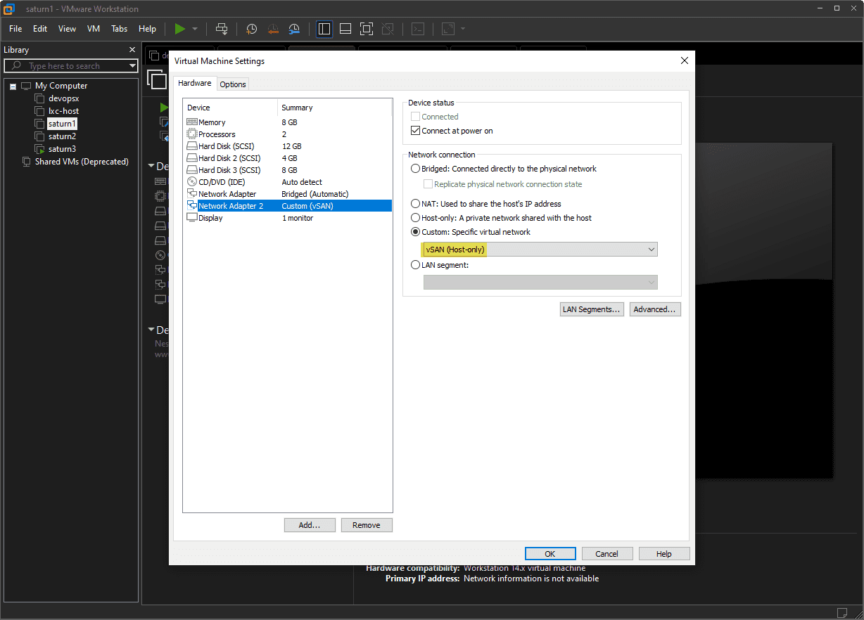 - VMware Workstation networking: (2) networks configured, (1) for management traffic/VM traffic, and (1) for vSAN traffic