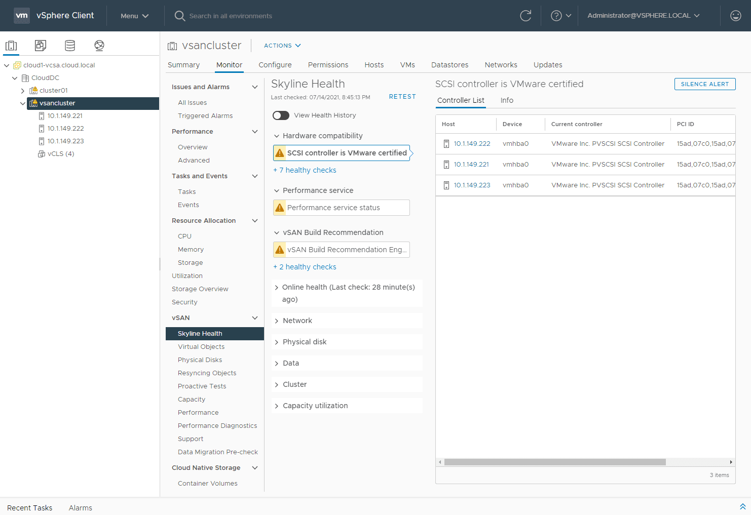 Looking at the Skyline Health screen, we see only a few warnings of things that you would expect such as controllers not being VMware certified, etc.