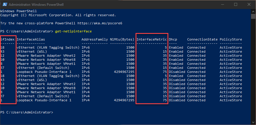 Using Powershell, you can easily view the interface metrics currently assigned to your adapters. To change the interface metric using PowerShell, you need to take note of the interface index column and the metric column.