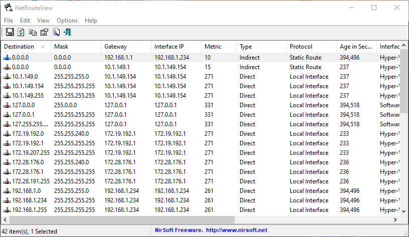 There is a great little freeware tool that allows doing this easily. It is called NetrouteView. it is freely downloaded from the link here: NetRouteView – Network Route Utility for Windows (nirsoft.net)