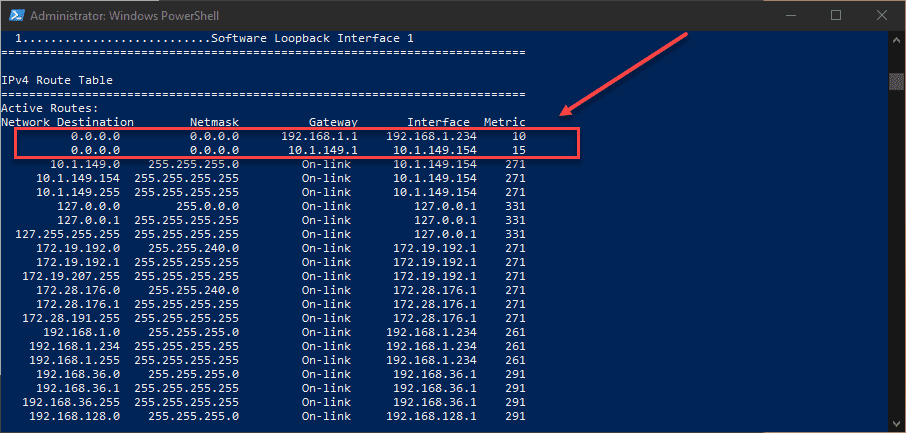 I have still seen issues from time to time with how traffic is routed, regardless of setting the interface metric. If you find that after you set your Windows 10 adapter order that traffic is still not being routed correctly, you may need to look at your route table. Take note of the following output. Note how I have two routes that can get to 0.0.0.0/0 or the default gateway. What if I want 10.1.149.1 to be the preferred route? As you see below, it has a higher metric than the 192.168.1.1 route. This means traffic will be routed to the default gateway of 192.168.1.1 instead of the preferred 10.1.149.1. To affect this, we need to change the route metric.