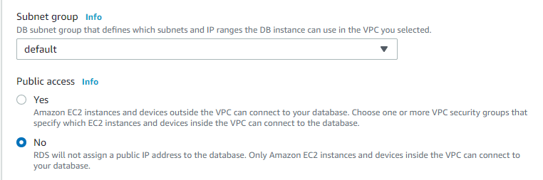 There are many different aspects of your RDS network configuration settings that determine the internal IPs configured for your RDS instance. First of all, when setting up RDS, you have the choice of whether or not you want the RDS instance to be publicly accessible. As you can see below, under the Public access configuration, you can choose the configuration as: