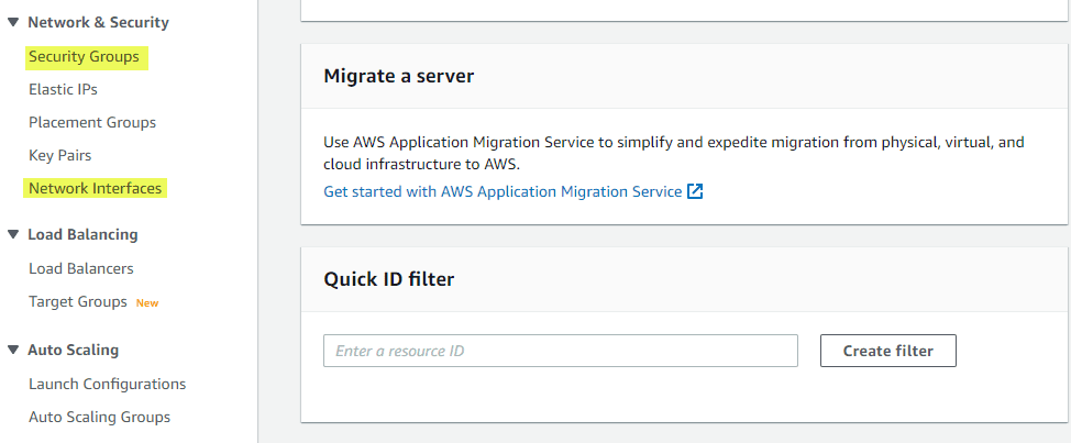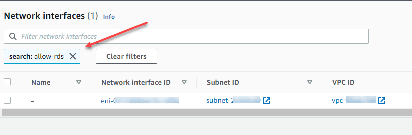 Before looking at the network interfaces dashboard, if you have many network interfaces associated with many different types of resources in AWS, it may be difficult to find your RDS instance internal network connection. However, an easy way to still find your RDS network interfaces is to filter them based on your security group name associated with the RDS connection.
