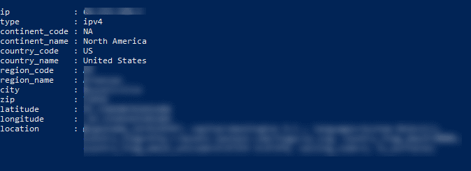 That’s it. Once you have the remote IP address, you can then pass this information into the ipstack API using PowerShell and get a return on the IP address. Below is an example of the returned output coming back from ipstack. It tells you the: