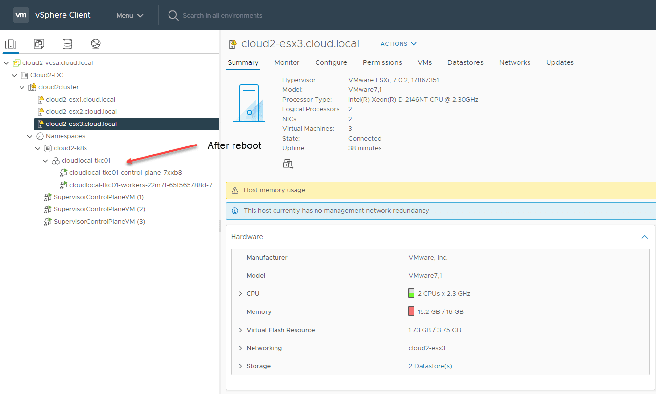 Next, shutdown or reboot your hosts for maintenance or other tasks. After bringing these back online, you should see your TKC services come back online without issue. Note below, everything is running once again.