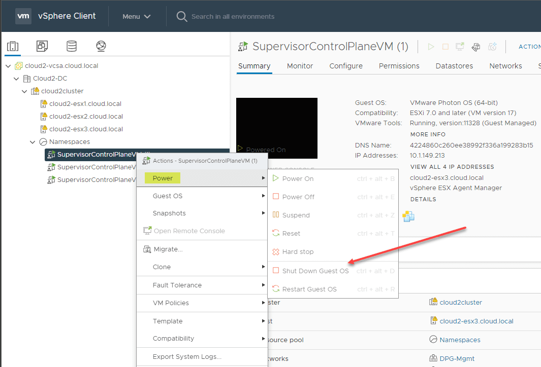 If you notice, you don’t have a shutdown option for the SupervisorControlPlane VMs that are running in inventory. For the Supervisor VMs and the workload VMs, we have to shut those down from the ESXi host directly.