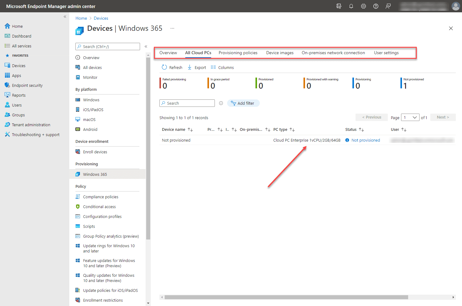 The first step you need to take is to purchase a Windows 365 Enterprise license. Visit the windows365.microsoft.com site and purchase the license and Windows 365 configuration you want to use for your end-user. After you have purchased the Windows 365 license, you will see it listed when you navigate to Devices > Provisioning > Windows 365 > All Cloud PCs in the Microsoft Endpoint Manager Admin Center.