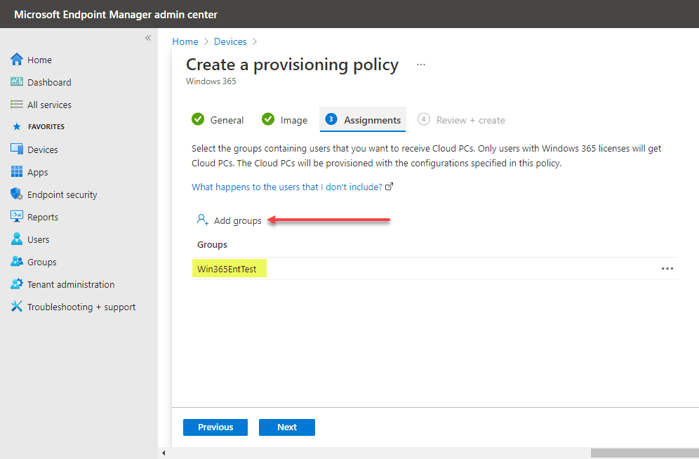 On the assignments screen, you will be prompted to select a group to assign the Windows 365 Enterprise desktop. As a note, the Windows 10 & 11 (when available) images allow multi-user connections. So, it makes sense here that you select a group, instead of a single user.