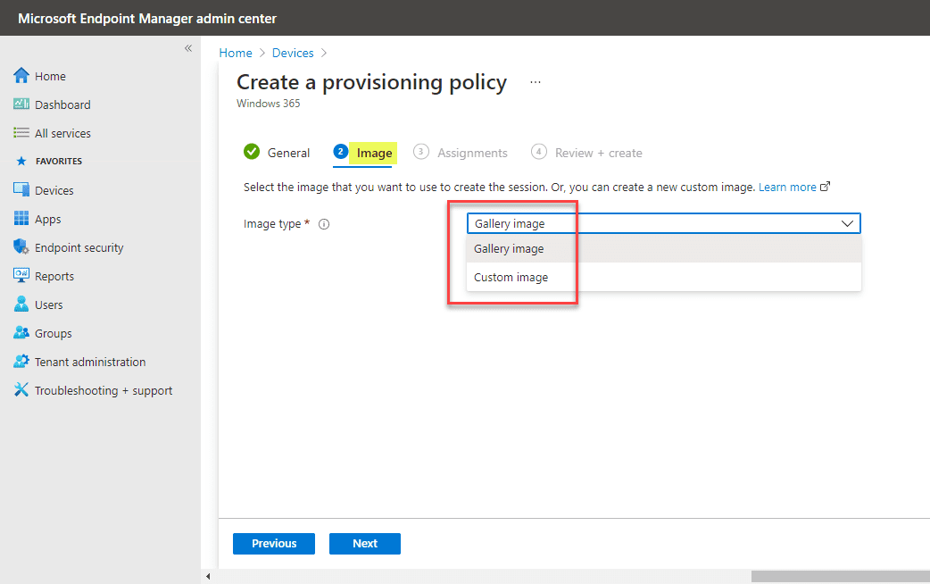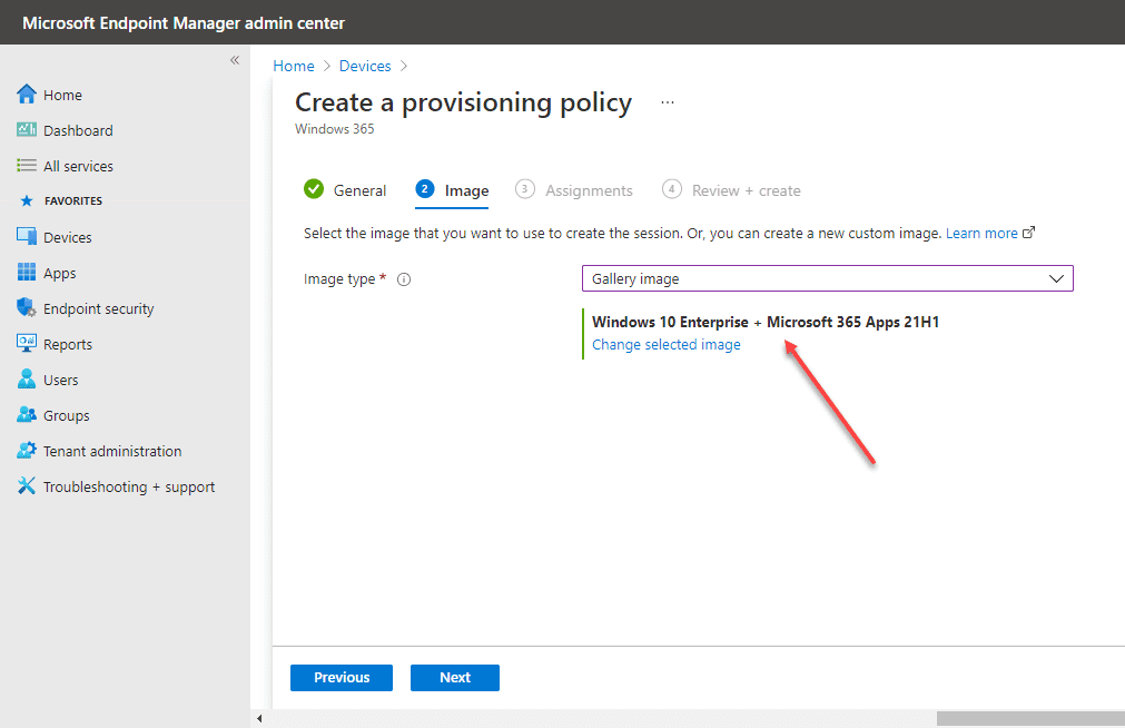 Select an image for use in provisioning the Windows 365 Enterprise Cloud PC. Note below, you can choose a Microsoft Azure Gallery image or use a custom image. Here I am selecting the Gallery image.