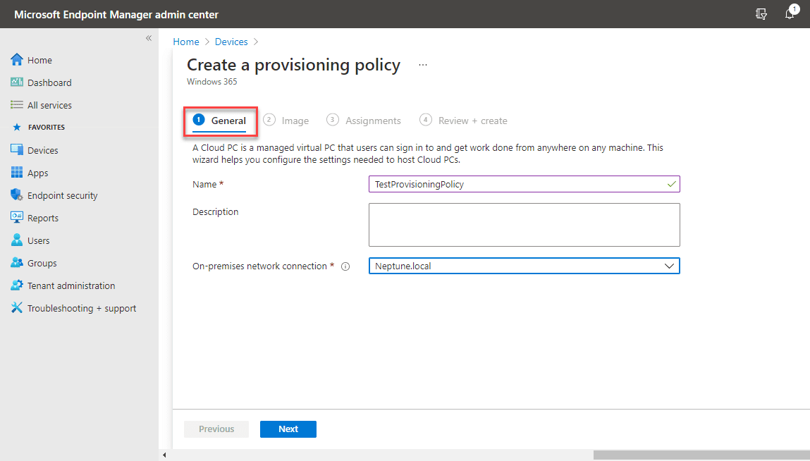 To actually provision the Windows 365 Enterprise Cloud PC, you need to create a provisioning policy. Below are the steps shown to step through the provisioning policy wizard. First, you need to name the policy and select the appropriate on-premises network connection