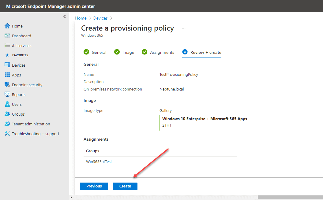 Finally, we review and create the provisioning policy.