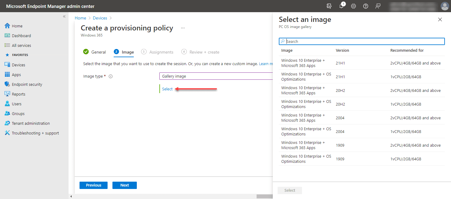 If you choose the Gallery image, you will see the Select an image dialog box to choose an image for use with Windows 365 Enterprise Cloud PC.