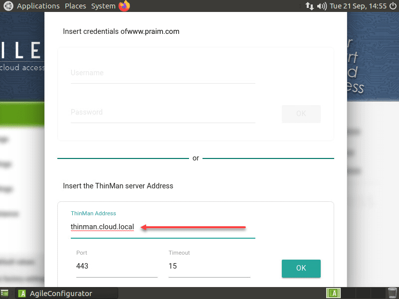 This launches the configurator and allows plugging in the ThinMan Server address for licensing and managing Agile4Linux. Alternatively, you can sign into your Praim account to license the solution.