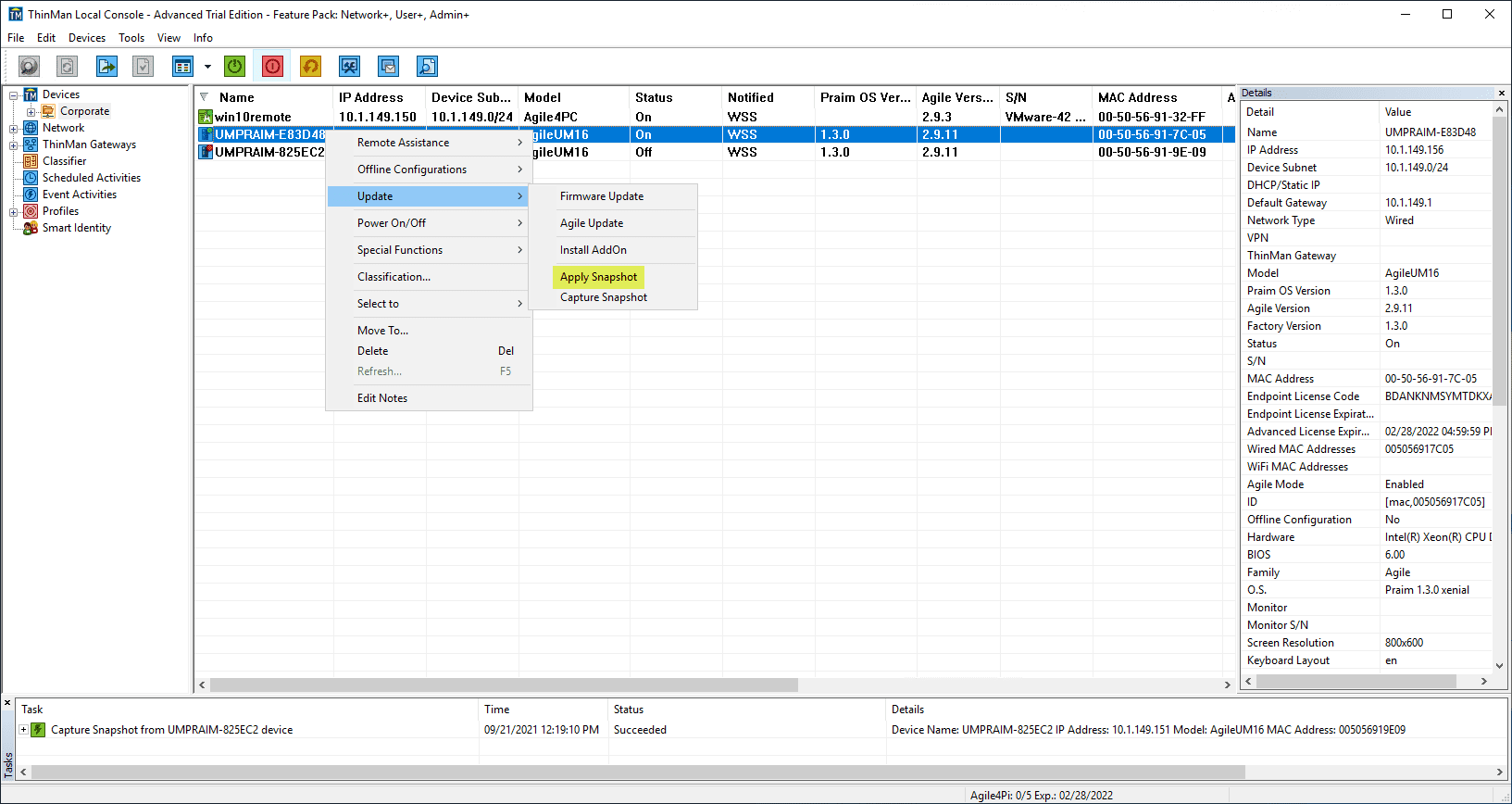 Now, I have spun up a clean thin client with Agile4Linux for a remote worker. I want to apply the snapshot to the new device. Click Update > Apply Snapshot.
