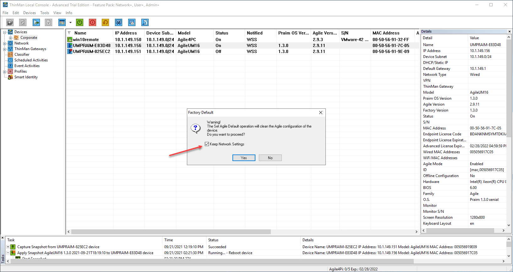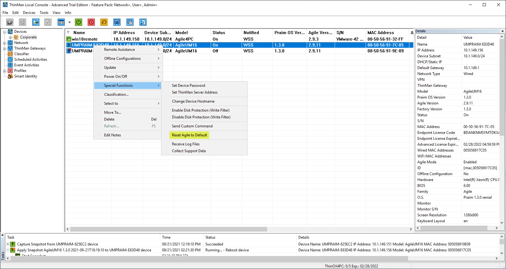 What if I want to reset the device back to the Agile4Linux defaults? For example, if I want to start a new Agile configuration on the device from scratch? We can do that from ThinMan Server. Right-click the device you want to reset, select Special Functions > Reset Agile to Default. This command will forget all the configurations made via the Praim Agile4Linux Configurator.