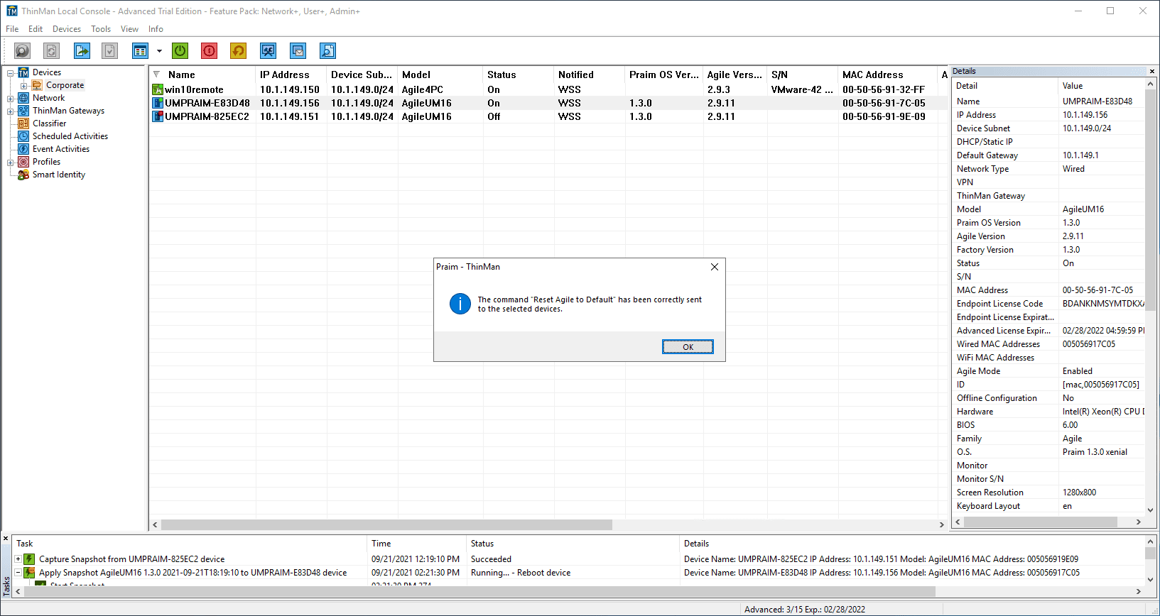The reset command is successfully sent to the remote Agile-featured thin client.