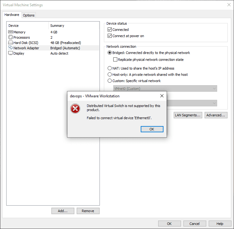 After removing the network adapter, I re-added the network adapter using VMware Workstation. However, after doing this, I still had no network connectivity? Also, the symptoms are the same, checking the box for Connected gives the vDS error. So, removing the network adapter was not removing the configuration.