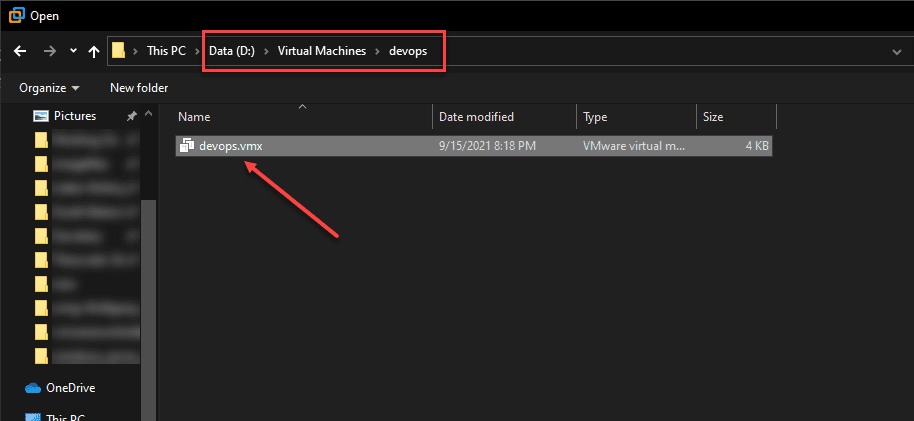 Next, I imported the VMX file contained in the folder with the Open virtual machine option in VMware Workstation.