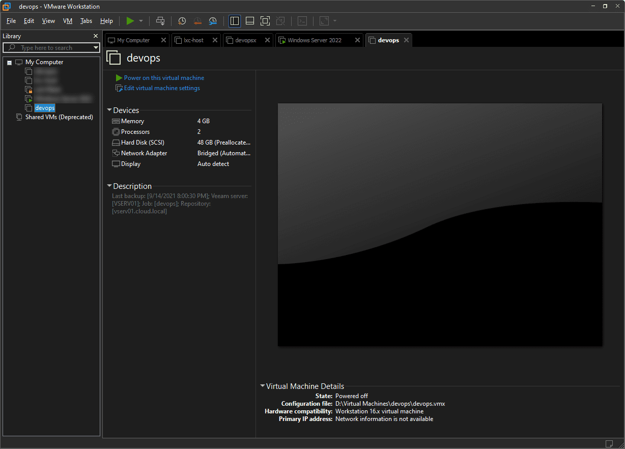 The VM is successfully imported. It is amazing there is no need to convert the disk or any other conversion process needed going from vSphere 7.0 Update 2 to VMware Workstation 16.