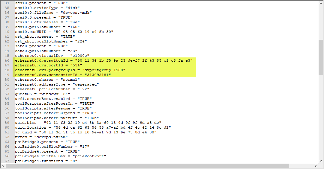 Just to be sure of the configuration needed, I spun up a blank Windows 10 VM as a shell to see the configuration added to the VMX file. After looking at the VMX file for that VM, I copied the following into the VMX configuration: