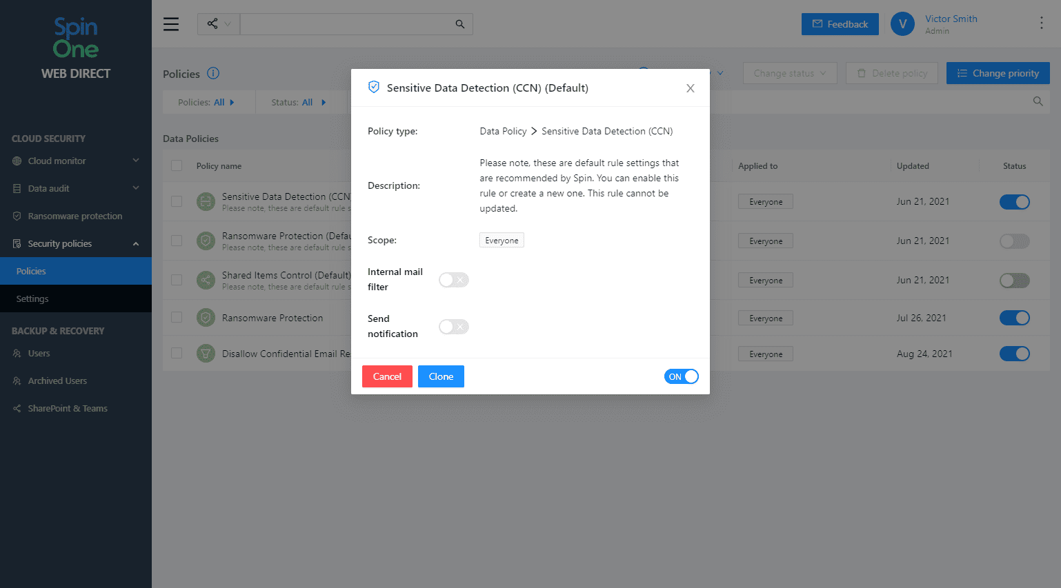 SpinOne provides the ability to create security policies that control security processes included with SpinOne: